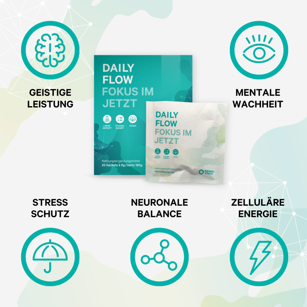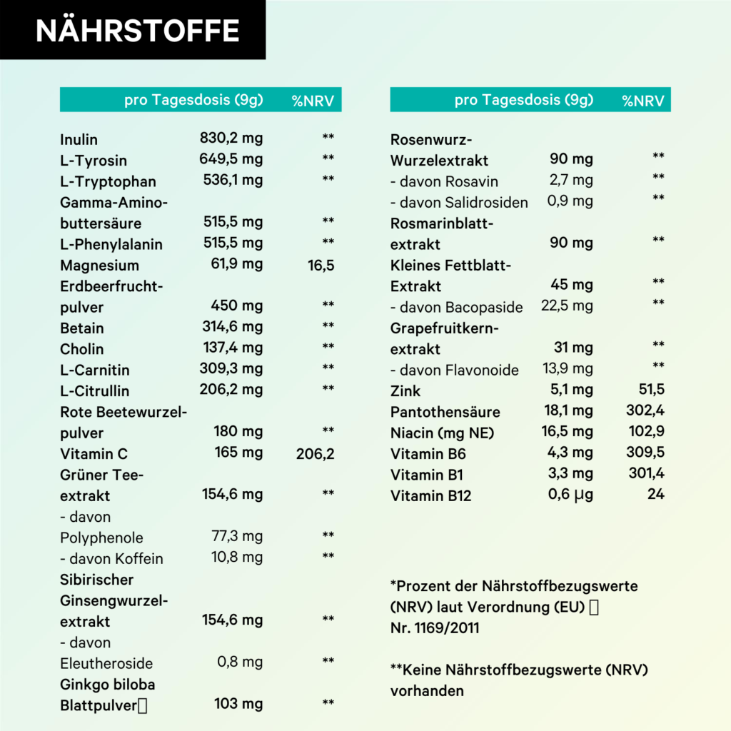 Gehirngerechte Pflanzenextrakte: Grüntee-Extrakt (mit Theacrin, L-Theanin und Koffein), Panax Ginseng-Extrakt, Ginkgo, Brahmi-Extrakt