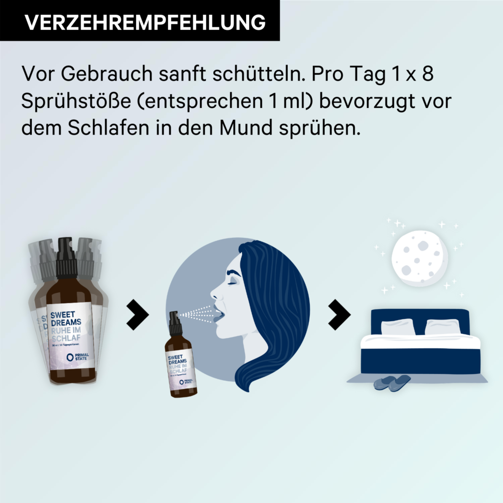 Nimm ca. 30 Minunten vor dem Zubettgehen 8 Sprühstöße des Sprays in den Mund und du verkürzt deine Einschlafzeit, unterstützt Nervensystem und Psyche.