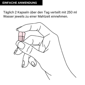 Tägliche Verzehrempfehlung: 2 Kapseln über den Tag verteilt (z. B. eine morgens, eine abends) mit 250 ml Wasser jeweils zu einer Mahlzeit einnehmen.