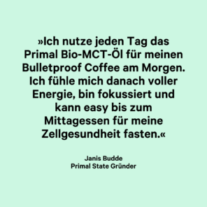“Ich nutze jeden Tag das Primal Bio-MCT-Öl für meinen Bulletproof Coffee am Morgen. Ich fühle mich danach voller Energie, bin fokussiert und kann easy bis zum Mittagessen für meine Zellgesundheit fasten.”